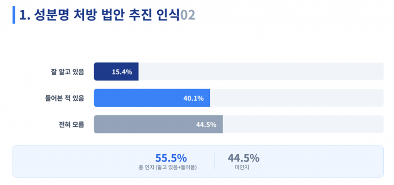 현재 국회에 발의된 성분명 처방 의무화 관련 법안에 대한 국민들 인지도는 매우 낮았다. 응답자 44.5%는 해당 법안에 대해 '전혀 모른다'고 답했고, '잘 알고 있다'는 응답은 15.4%에 그쳤다.