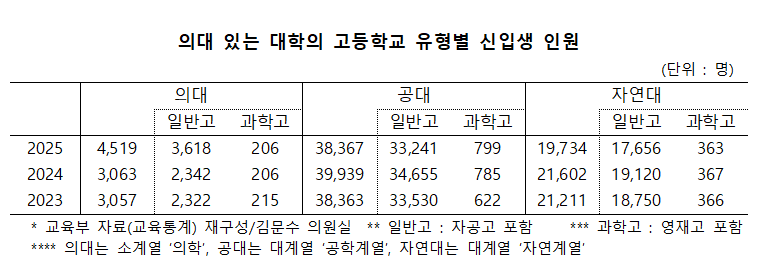 국회 교육위원회 김문수 의원(더불어민주당)은 16일 교육부로부터 제출받은 '의대가 있는 대학의 의대, 공대, 자연대별 고등학교 유형별 신입생 인원 및 비중' 자료를 분석한 결과를 공개했다.