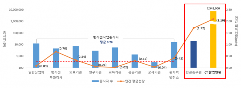 실제 우리나라 국민의 CT 이용에 따른 연간 평균 피폭량은 2.1mSv로 나타났다. 이는 항공기 승무원의 피폭량(1.72mSv)보다 높을 뿐만 아니라, 방사선 작업종사자의 평균 피폭량인 0.28mSv와 비교하면 약 8배에 달하는 수준이다.