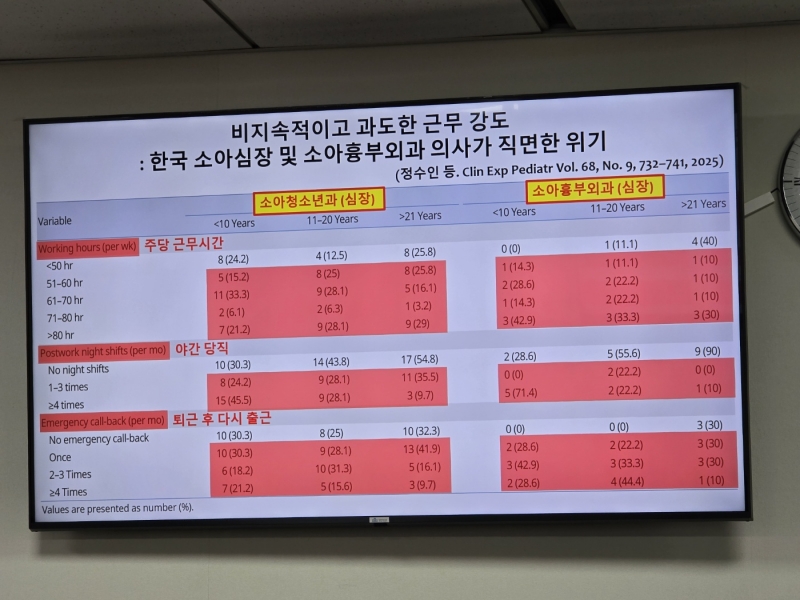 설문조사 결과 소아심장 전문의 75% 이상이 주당 50시간 이상 근무하며, 30%는 80시간 이상을 일하는 것으로 나타났다. 50대 이상 베테랑 교수 절반 이상이 야간 당직을 서고 있는 실정이다.