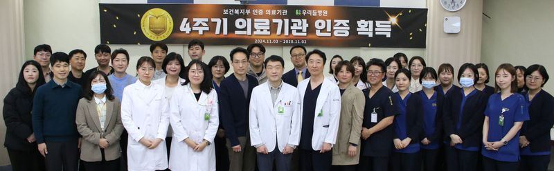 우리들병원은 기본가치, 환자치료, 조직관리, 성과관리 등 4개 영역 92개 기준, 507개 항목 중 해당되는 조사에서 모두 평균점수를 충족해 4주기 의료기관 인증을 받았다.