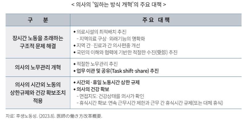 보고서에 따르면 주요 대책으로는 시간외‧휴일 노동시간 상한 규제, 의사의 건강 확보, 업무 이관 등이 포함돼 있다.
