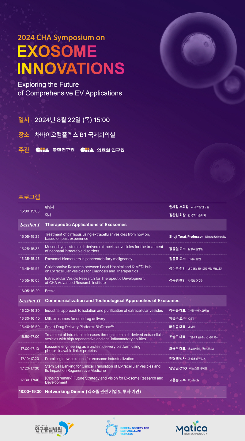 이번 심포지엄은 권세창 차의료원 R&D사업화총괄 부회장 환영사와 한국엑소좀학회 김완섭 회장의 축사를 시작으로 총 2개 세션으로 구성된다.
