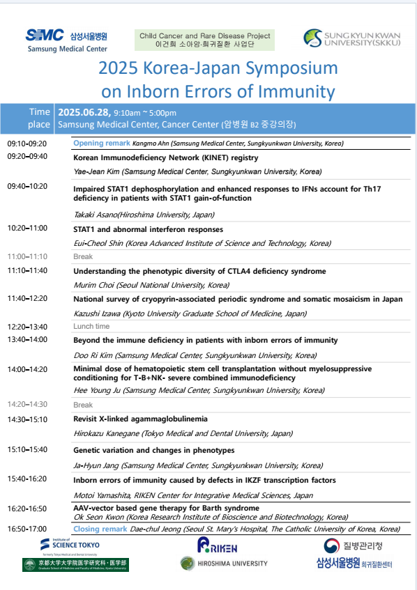 이번 심포지엄에서는 한국과 일본의 선천면역 이상질환 및 유전학 분야 전문가들이 최신 연구동향과 임상경험을 공유하고 협력의 토대를 마련할 예정이다.