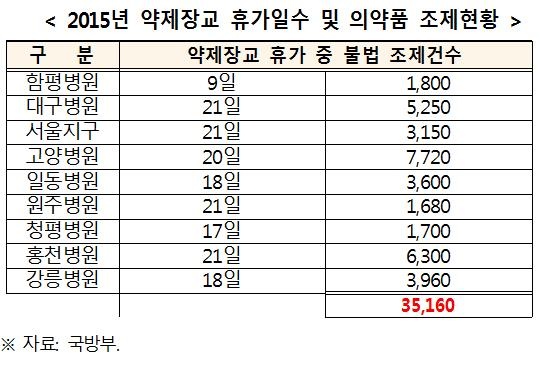 국회 국방위원회 소속 새누리당 김학용 의원이 국방부로부터 제출받은 ‘군병원 의약품 조제 현황 자료’를 분석한 결과, 지난해 전국 9개 군병원에서 약제장교 휴가 및 부재 중인 상황에서 면허가 없는 약제병이 조제한 의약품이 무려 3만5000건에 달했다.