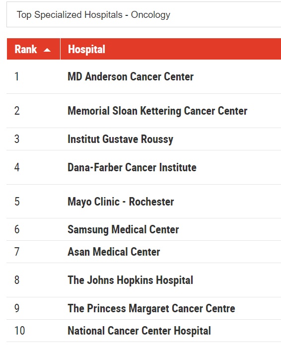 종양 분야에서 삼성서울병원보다 앞서 있는 곳은 MD앤더슨, 메이요클리닉 등 5개에 불과하며, 세계적인 병원으로 알려진 존스홉킨스병원도 삼성서울병원 뒤에 포진하고 있다. 의료 선진국이라 칭하는 일본 암병원보다는 한참 앞선 실력을 보이고 있다.