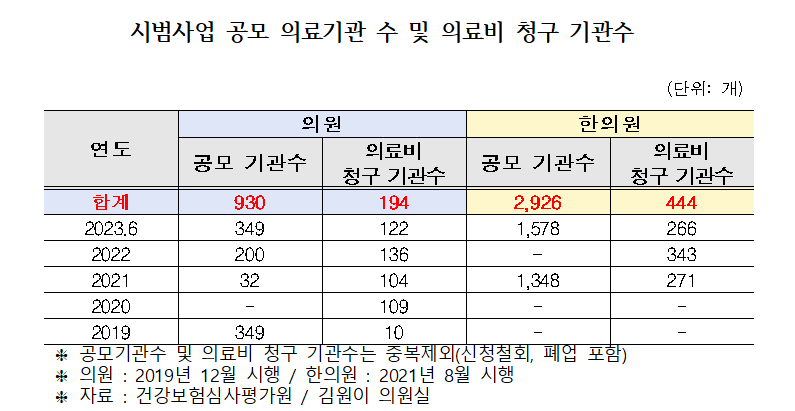 자료에 따르면 지난 2019년부터 올해 6월까지 시범사업에 공모한 의료기관은 총 3856곳이다. 의원 930곳, 한의원 2926곳이 신청했다.