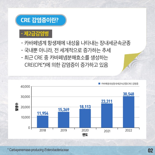 지난 2018년에 CRE 감염은 1만1954건이었으나 2022년 3만522건으로 지속 증가했다. 이로 인한 사망도 지난 2018년 141건에서 2022년 527건으로 늘어났다.