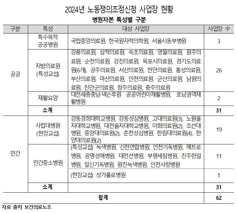 보건의료노조는 "지난 13일 62개 사업장 의료기관을 대상으로 노동위원회에 노동쟁의조정신청서를 제출했다"고 밝혔다.