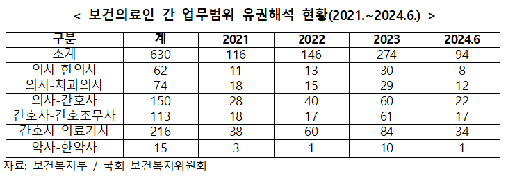 실제 지난 2021년부터 금년 6월까지 보건복지부가 보건의료인 간 업무범위 관련 유권해석 요청에 대해 해석을 내린 사례는 총 630건이다.