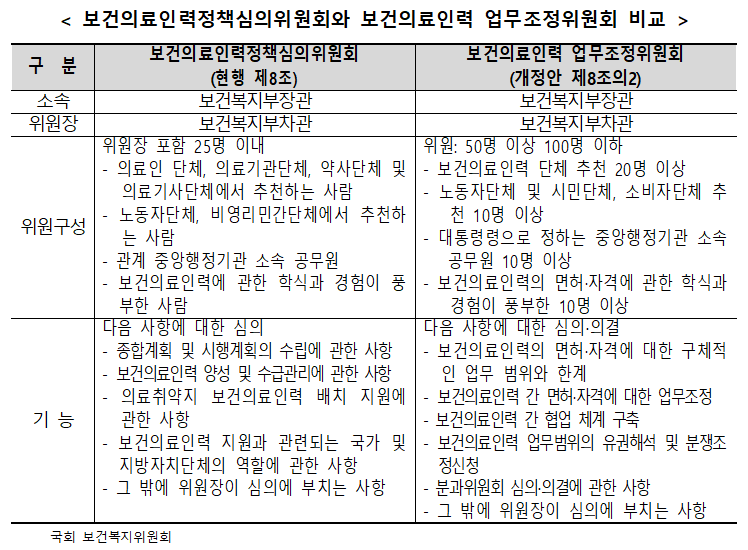 이지민 수석전문위원은 "개정안 취지에는 공감하나 해당 법의 목적이 보건의료인력 종합계획 목적인 보건의료인력 수급 및 근무환경 개선이라는 점, 업무범위를 의료법 등 관계법령에서 규정하고 있다는 점을 고려하면 관련 위원회 설치를 해당 법으로 규정하는 게 바람직한지 논의해야 한다"고 지적했다.