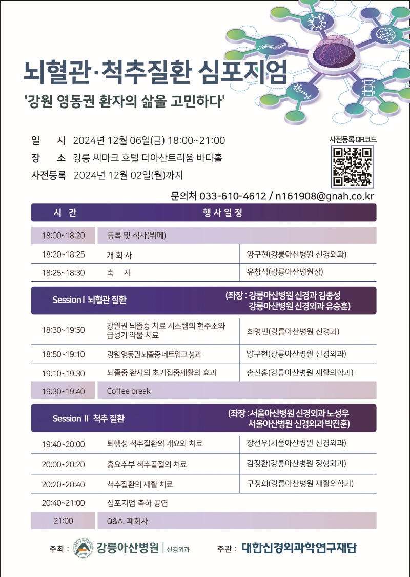강릉아산병원 신경외과에서 주최하고 대한신경외과학연구재단에서 주관하는 이번 심포지엄은 △뇌혈관 질환 △척추 질환 등 두 개의 세션으로 구성돼 '강원ㆍ영동권 환자 삶을 고민하다'라는 주제로 진행된다.