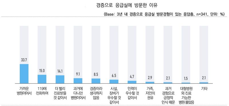 경증으로 대형병원 응급실을 방문한 이유로는 '대형병원 응급실이 가장 가까운 병원이어서'(33.7%)라는 응답이 가장 많았다.