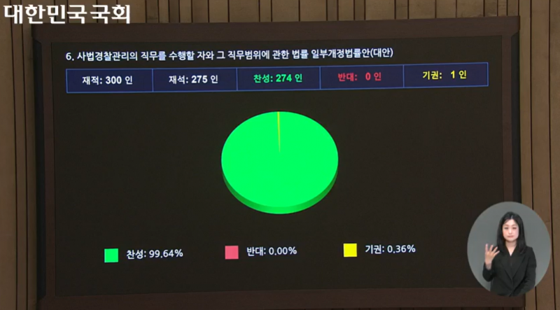 특사경법은 앞서 24일 법제사법위원회 심사를 거쳐 총 4건의 개정안을 통합·조정한 대안으로 본회의에서 재석 275인 중 찬성 274인, 기권 1인 등의 표를 얻었다.