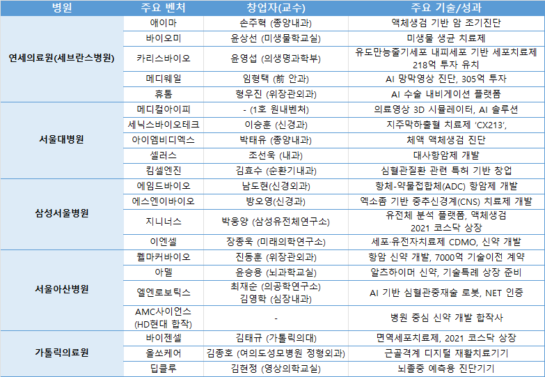 국내 빅5 병원(서울대병원, 세브란스병원(연세의료원), 삼성서울병원, 서울아산병원, 가톨릭의료원) 등은 원내 스타트업 실험과 신약·의료기술 상용화 성과가 차츰 구체화되고 있다.
