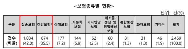 보험 종류별로는 실손보험이 1034건(42%)으로 가장 많았고, 건강보험(874건·35.5%)을 포함하면 의료·진단비 관련 분쟁이 전체의 77.5%를 차지했다.