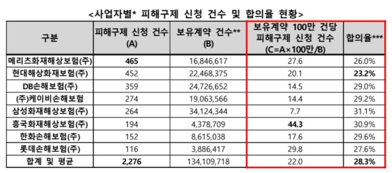 보험사별로는 메리츠화재해상보험이 피해구제 신청 465건으로 가장 많았고, 현대해상화재보험(452건), DB손해보험(359건)이 뒤를 이었다.
