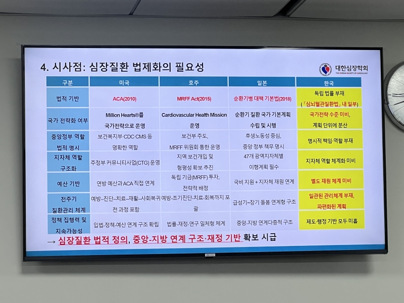 그는 “세계 주요국은 심장질환을 별도 법률로 관리하고 중앙정부의 기본계획 수립을 의무화하는 등 국가 전략이 있다”며 “우리만 아무 기반 없이 개별 기관이 스스로 버티는 구조”라고 말했다.