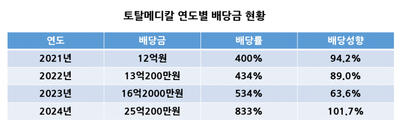 감사보고서에서 눈에 띄는 부분은 배당 흐름이다. 토탈메디칼은 가파른 성장세를 바탕으로 꾸준히 고배당 기조를 이어가고 있다.