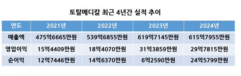 25일 토탈메디칼 감사보고서에 따르면 최근 4년간 매출액은 ▲2021년 475억6665만원 ▲2022년 539억6855만원 ▲2023년 619억7145만원 ▲2024년 615억7955만원으로 나타났다.