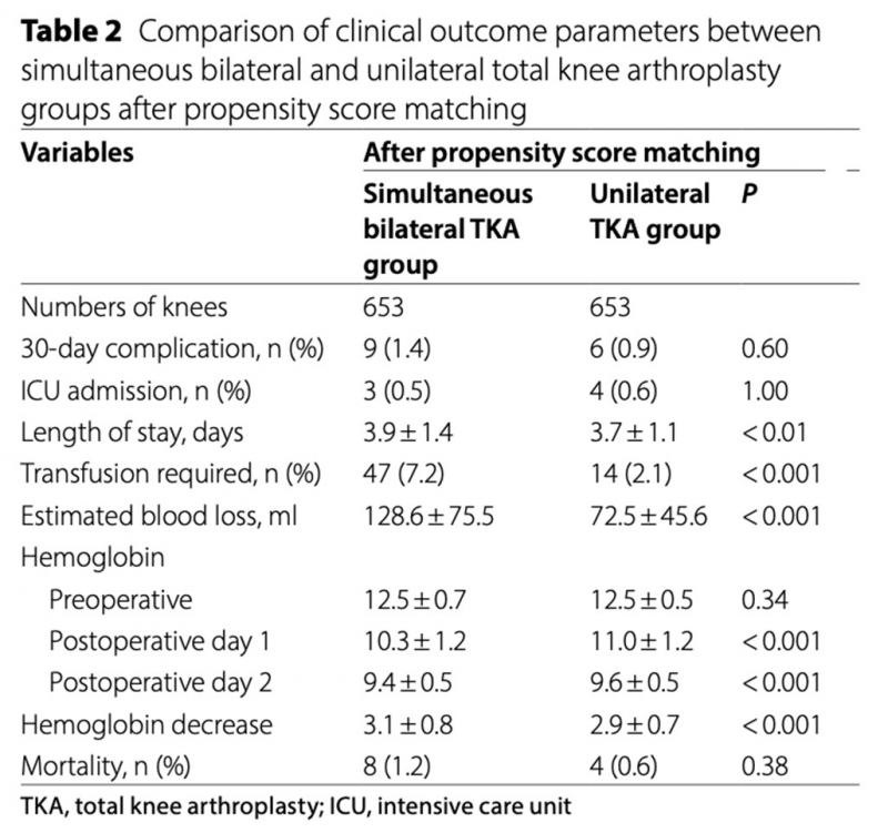 이 중 양측 동시 수술군(659명)과 단측 수술군(996명)에서 나이, 성별, 체질량지수, 추적관찰 기간, 동반질환 등을 고려해 각각 653명을 성향 점수 매칭 후 비교 분석했다.