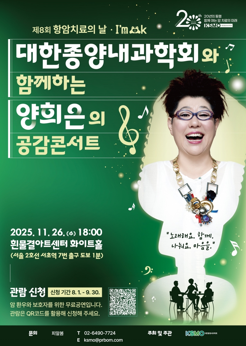 대한종양내과학회는 오는 11월 26일 수요일 오후 6시, 흰물결아트센터 화이트홀에서 ‘대한종양내과학회와 함께하는 양희은의 공감콘서트’를 개최한다고 4일 밝혔다.