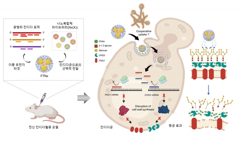 연구팀은 칸디다라는 곰팡이균의 세포벽을 만드는 데 중요한 두 가지 효소 — β‑1,3‑글루칸 합성효소(FKS1)와 키틴 합성효소(CHS3)를 동시에 표적하는 짧은 DNA 조각(antisense oligonucleotide, ASO)을 탑재한 금 나노입자 기반 복합체를 제작했다.
