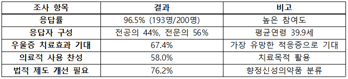 이에 가톨릭대학교 여의도성모병원 최원석 교수 연구팀(교신저자 한림대성심병원 정신건강의학과 전덕인 교수)은 2023년 3월부터 6월까지 국내 주요 정신의학 학술대회 3곳에서 정신건강의학과 전문의와 전공의 총 193명을 대상으로 사이키델릭 약물에 대한 지식과 의견을 묻는 설문조사를 실시했다. 응답률은 96.5%에 달했고 응답자 중 44%는 전공의, 56%는 전문의였다.