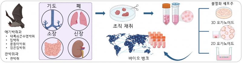 연구진은 한국, 동북아시아, 유럽에 널리 서식하는 식충성 박쥐인 애기박쥐과(Vespertilionidae) 및 관박쥐과(Rhinolophidae) 박쥐 5종으로부터 기도, 폐, 신장, 소장의 다조직 오가노이드 생체 모형을 구축했다.