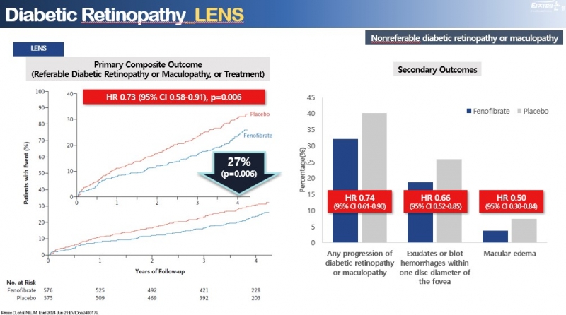 여기서 페노피브레이트는 이전 FIELD 연구 하위분석, ACCORD 임상연구에서 당뇨망막병증 진행 위험을 낮춘다는 가능성을 확인시켜줬다. 특히 해당 결과를 근거로 진행된 LENS 연구에서도 페노피브레이트가 초기 망막 변화가 있는 성인 환자의 당뇨병망막병증 진행을 지연시켜 주는 것을 재차 확인시켜줬다.