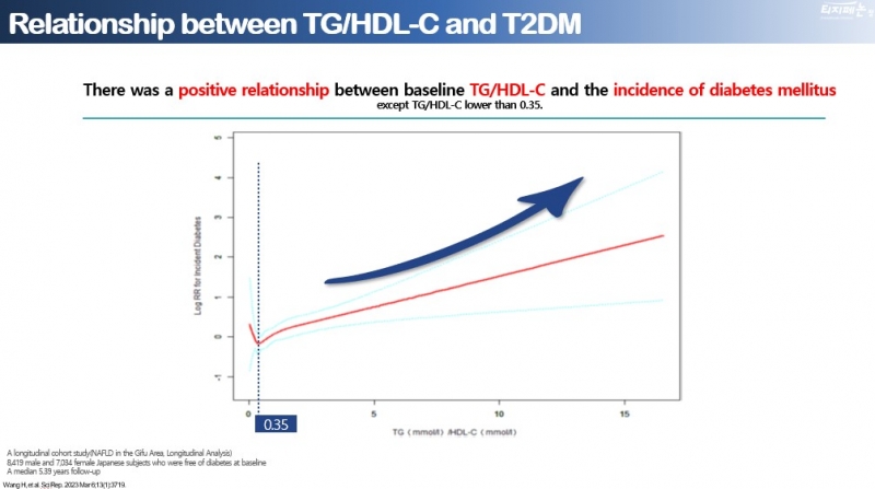 과거 여러 연구들을 통해, 인슐린 저항성이 있는 환자에서 HDL-C(고밀도 지단백 콜레스테롤)은 낮았고, TG(중성지방)의 경우 높았다. 이에 따라 TG/HDL-C와 당뇨병 유병률이 양의 상관관계를 보인다는 것을 알 수 있다. 이 외에도 당뇨병 환자의 경우, 대개 TG가 높고 HDL-C가 낮으며 sd-LDL(Small Dense LDL)이 높은 이상지질혈증 특징을 지닌다. sd-LDL은 미세 크기의 단단한 LDL(저밀도 지단백 콜레스테롤)로, sd-LDL이 증가할수록 TG도 함께 높아지는데, 이는 인슐린 저항성과 관련이 있고 동맥경화성 심혈관질환(ASCVD) 발생과도 관련 있다.