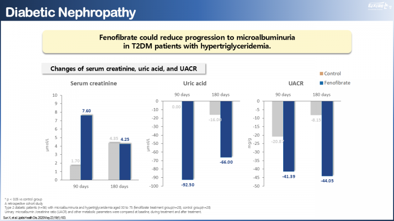 2형당뇨병 환자들을 대상으로 시행된 FIELD, ACCORD-Lipid 등의 연구에서 페노피브레이트가 위약 대비 당뇨병성망막병증(Diabetic Retinopathy) 진행률, 레이저 치료 필요성을 감소시킴을 확인했다. 뿐만 아니라 페노피브레이트는 당뇨병성 신장질환(DKD), 미세 알부민뇨(microalbuminuria, 단백뇨)와 대규모 알부민뇨 발생률을 모두 낮췄다.