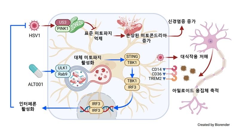 이를 토대로 연구팀이 개발한 미토파지 촉진제 ALT001은 HSV-1 감염을 억제하고 신경 염증을 완화하는 효과를 보였다.