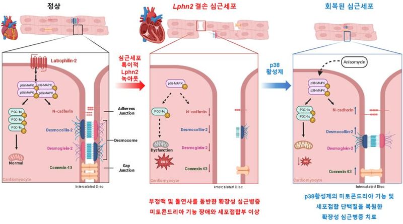 연구팀은 이러한 병태생리를 증명하기 위해서, ‘p38-MAPK 경로 활성제’를 투여해 라트로필린-2 결손 마우스의 확장성 심근병증이 치료되는 것을 확인했다.