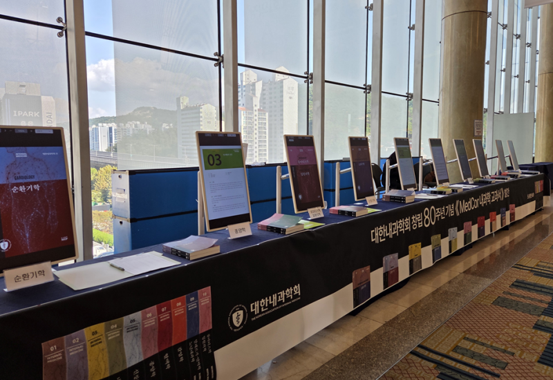 내과학회는 80주년을 맞아 오랜 숙원 사업인 국내 최초 통합 내과 교과서를 발간하는 성과를 냈다. 학술대회장 앞에는 전자책, 종이책(샘플) 교과서가 전시돼 있었다.