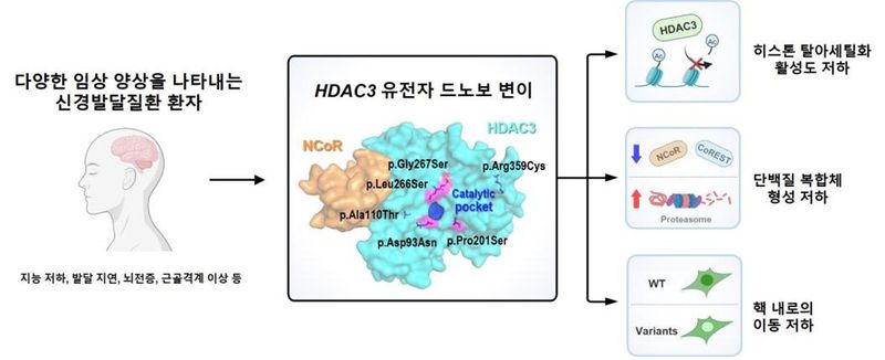 HDAC3는 유전자 발현을 조절하는 히스톤 탈아세틸화 효소라는 단백질을 만드는 유전자로, 이번 연구를 통해 이 유전자의 변이가 신경발달장애와 관련될 수 있음을 처음으로 밝혀냈다.