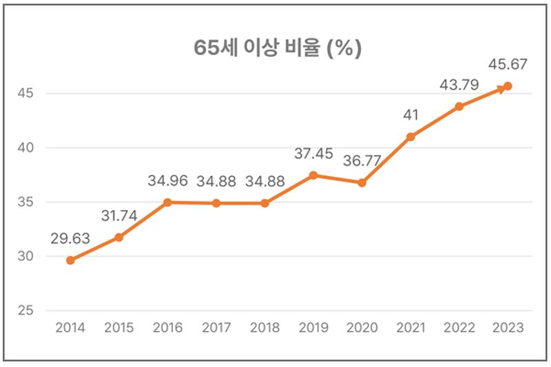 지난 10년간 평균 연령은 매년 증가해 2023년에는 남성 58.9세, 여성 64.26세로 나타났으며 이 가운데 65세 이상의 고령환자는 45.67%를 기록, 절반 가까운 비중을 차지했다.