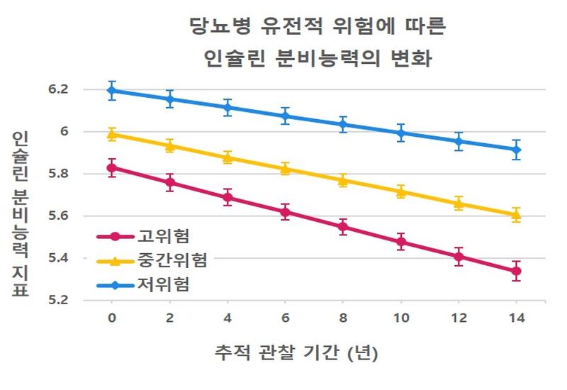 특히 저위험군에 비해 고위험군의 인슐린 분비능력 감소 속도는 1.83배 빨랐다. 즉 유전적 요인에 의해 인슐린 분비능력의 장기적인 변화가 결정됐다.