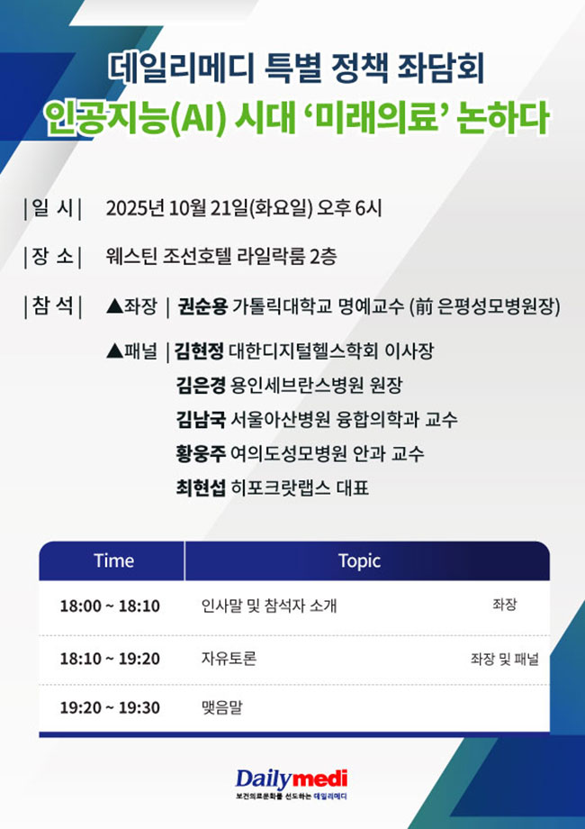 데일리메디는 2025년 특별기획 ‘인공지능(AI) 시대, 미래 의료를 논한다’를 주제로 정책 좌담회를 개최한다.