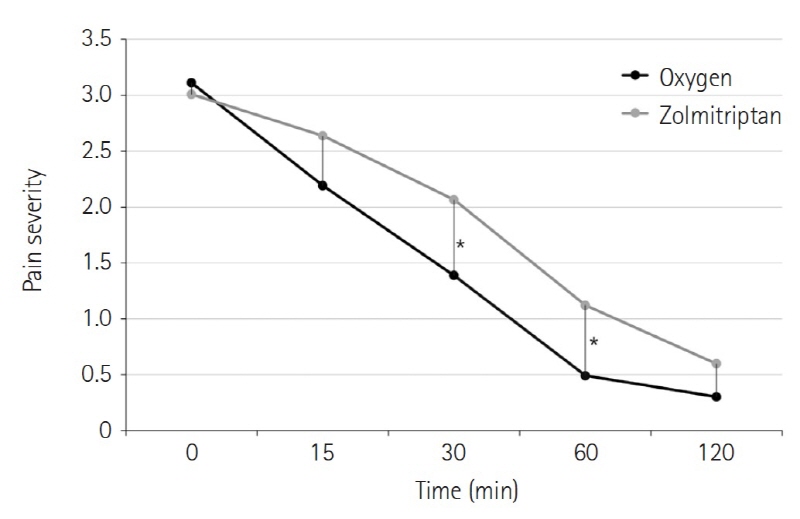 통증이 완전히 사라졌다고 응답한 비율 역시 산소치료와 약물치료에서 각각 15분 후 12.7% 대 8.1%, 30분 후 31.7% 대 14.5%, 60분 후 66.7% 대 43.5%, 120분 후 81% 대 71%로 산소치료 그룹이 높았다.