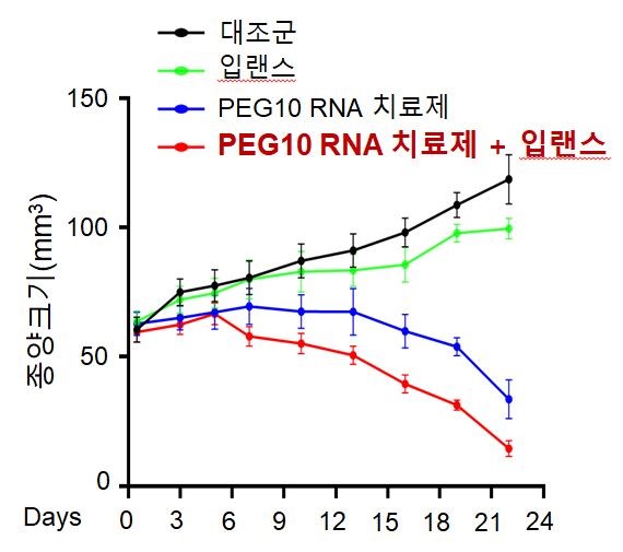입랜스 단독 투여 시에는 종양 크기가 계속 커져 항암 효과가 없었으나, PEG10 RNA 치료제를 단독 투여 시 종양 크기가 76% 감소했다.
