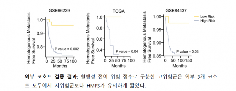 세 개 외부 코호트(TCGA, GSE66229, GSE84437, 총 600명 이상)와 환자 유래 이종이식(PDX) 모델 51개를 이용해 검증한 결과, 고위험군에서 HMFS이 유의하게 짧았다(각 코호트 P=0.002, 0.04, 0.03; PDX P=0.0001).