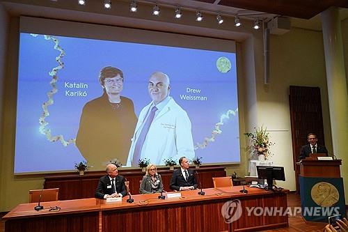 2일(현지시간) 스웨덴 카롤린스카 연구소 노벨위원회는 커털린 커리코 헝가리 세게드 대학 교수와 드루 와이스먼 미국 펜실베이니아대학 페렐만 의대 교수를 올해 생리의학상 수상자로 선정했다고 발표했다.