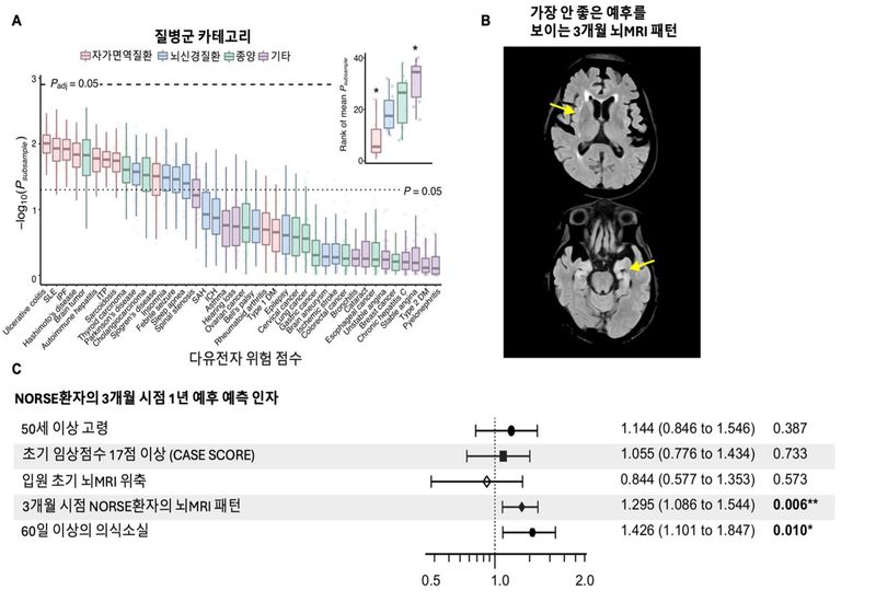 다유전자 위험 점수를 자가면역 및 염증성 질환, 뇌신경질환, 종양, 기타 4가지 질병군 40개 질환과 비교한 결과 NORSE가 자가면역 및 염증성 질환과 유사한 유전적 패턴을 보였다.