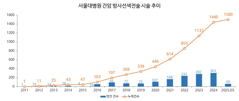 서울대병원 간암센터는 지난 2011년 첫 방사선색전술을 시작으로 시술을 점차 확대해 2024년 한 해에만 303례를 실시했다. 이어 지난 25일 총 시술 1500례를 달성했다.