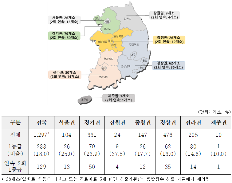 1등급 기관 중 2회 연속으로 1등급을 유지한 기관은 총 129개소에 달하며, 권역별로는 경기권(79개소), 경상권(62개소), 전라권(30개소) 순으로 많았다. 서울은 26개소가 1등급을 받았고, 제주에서는 단 1곳만이 1등급에 포함됐다.