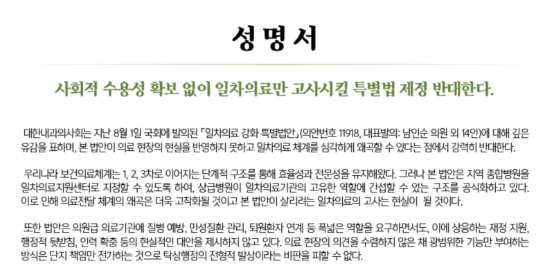 대한내과의사회는 7일 성명서를 통해 "지난 8월 1일 국회에 발의된 '일차의료 강화 특별법안'에 대해 유감을 표한다"고 밝혔다.