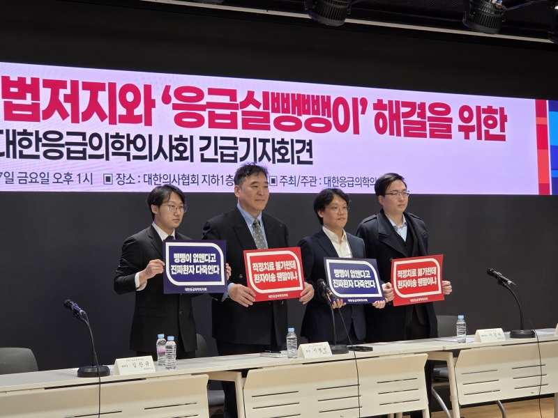 대한응급의학의사회(회장 이형민, 이하 의사회)는 7일 오후 대한의사협회 회관에서 ‘119 강제수용 입법저지와 응급실뺑뺑이 해결을 위한 긴급기자회견’을 개최했다.