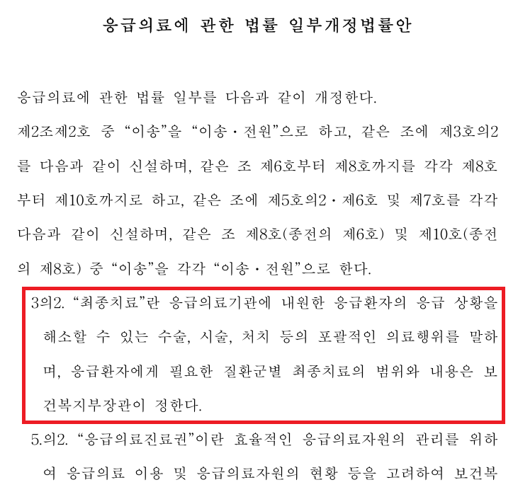 개정안 주요 내용은 ▲최종 치료 개념 명확히 정의 ▲응급환자를 수용할 수 없는 정당한 사유를 보건복지부령으로 규정 ▲전화로 수용능력을 확인하는 규정 삭제 ▲수용불가 사전고지제도 도입 ▲실시간 수용 가능 정보·진료기능 정보 등 확인 시스템 구축·운영 ▲권역응급의료센터(44개), 지역응급의료센터(151개) 24시간 2인 1조 근무 등이다.