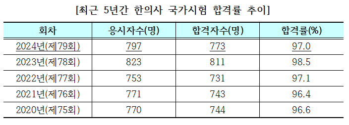 한의사 국가시험은 797명 중 773명이 합격해 97%이라는 합격률이 나왔다.